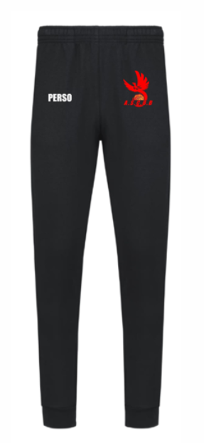 Pantalon de survêtement noir avec logo club sur une jambe et initiales sur l'autre jambe